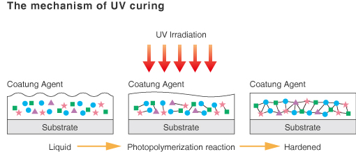 液態(tài)材料在UV光子的作用下發(fā)生交聯(lián)固化成膜